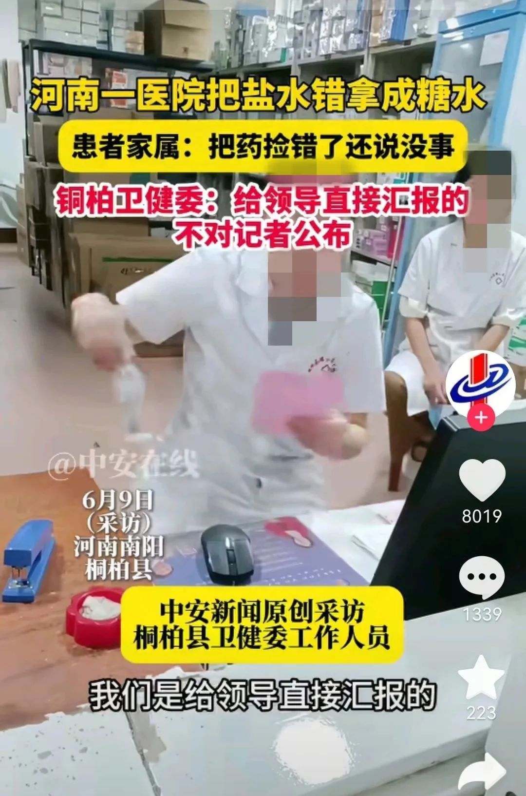 6月7日,有河南网友发视频称,其家中有患者患有糖尿病,桐柏县一医院药房人员却把盐水错拿成糖水,还说没事。9日上午,记者电话联系了桐柏县卫健委,卫健委工作人员表示:这件事他们只向领导直接汇报,不对记者公布。